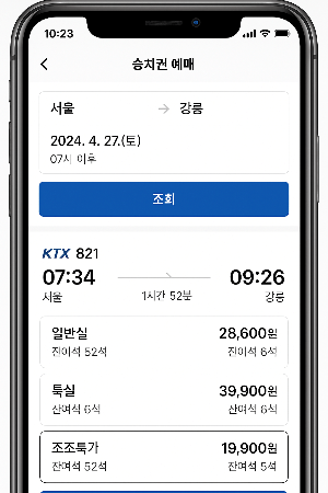 앱 실행 후 승차권 예매 메뉴에서 출발역과 도착역, 날짜와 시간대를 입력하면 실시간 시간표와 잔여석 정보를 조회할 수 있습니다. 평일과 주말, 성수기별로 시간표가 달라지므로 출발 전 반드시 최신 정보를 확인하세요.