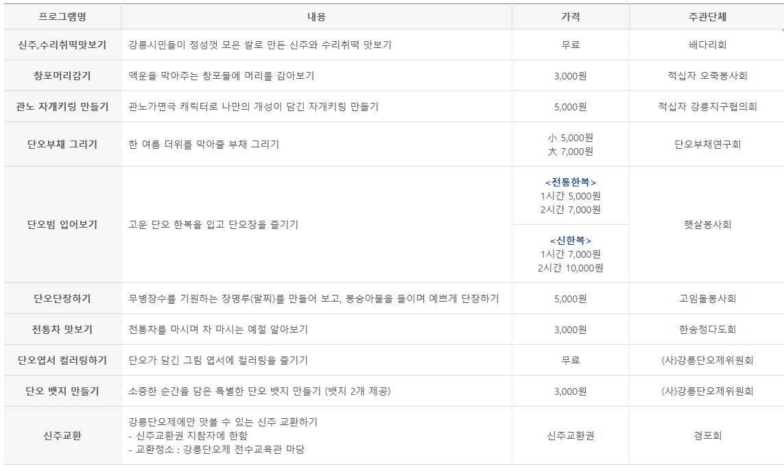 - 축제장소 : 강릉단오제 전수교육관 공연장 / 남대천 행사장
